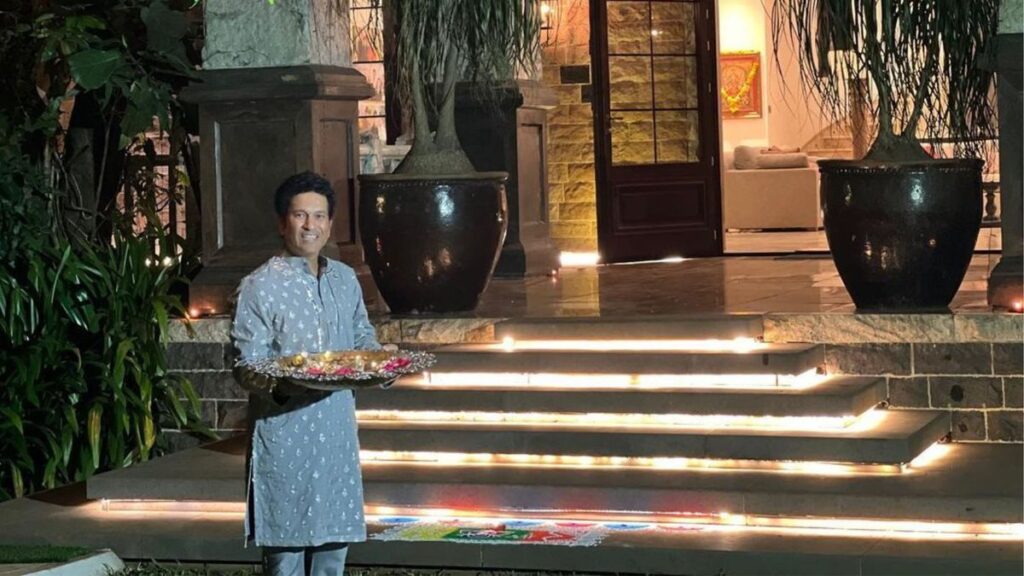 Sachin’s 5-story house has a temple, a garden with palm trees, and large living spaces. It’s a mix of modern and traditional design.