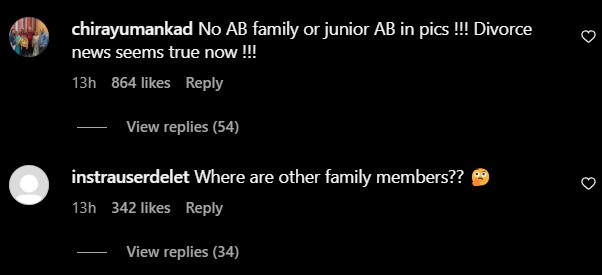 “No AB family or junior AB in pics!!! Divorce news seems true now,” a user commented.