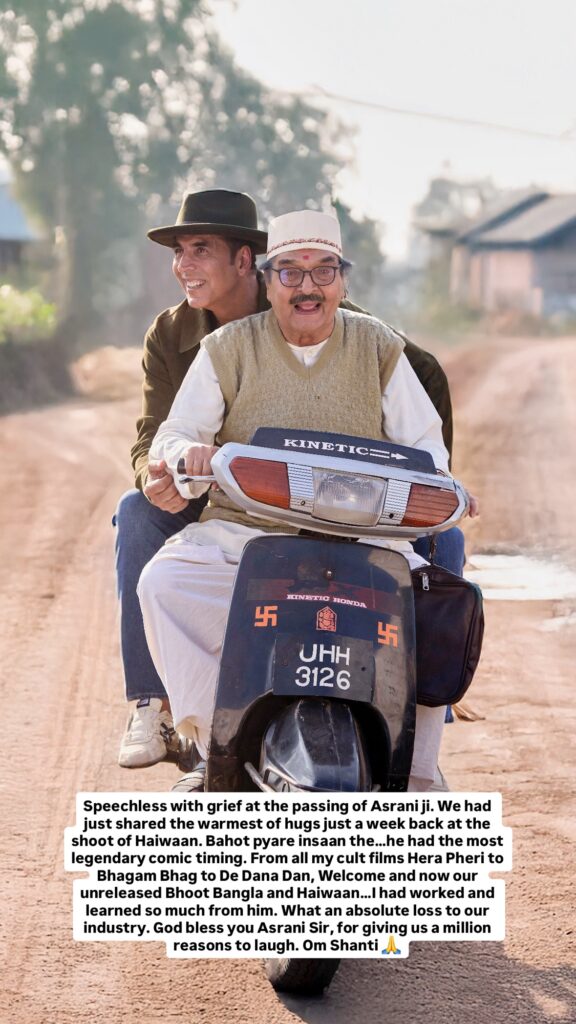 “Speechless with grief at the passing of Asrani ji. We had just shared the warmest of hugs just a week back at the shoot of Haiwaan. Bahot pyare insaan the…he had the most legendary comic timing,” Akshay, who will be seen with Asrani in the upcoming projects “Bhoot Bangla and Haiwaan”, wrote as the caption.
