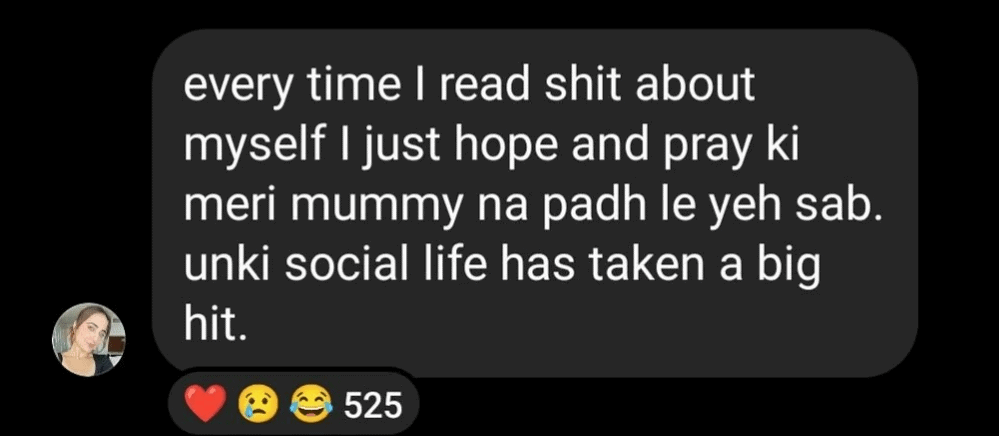 In another statement, she wrote, “Every time I read shit about myself I just hope and pray ki meri mmmy na padh le yeh sab (I hope and pray that my mother doesn’t read all this), unki social life has taken a big hit.”