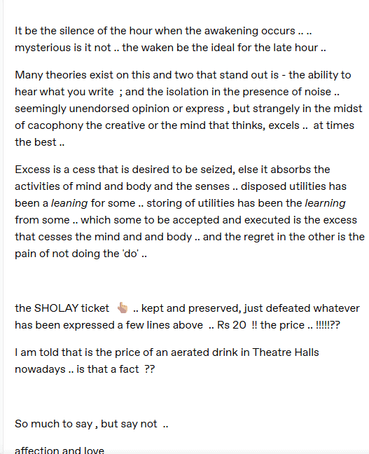 He wrote on his blog: “The SHOLAY ticket… kept and preserved, just defeated whatever has been expressed a few lines above .. Rs 20 !! the price .. !!!!!?? (sic).”