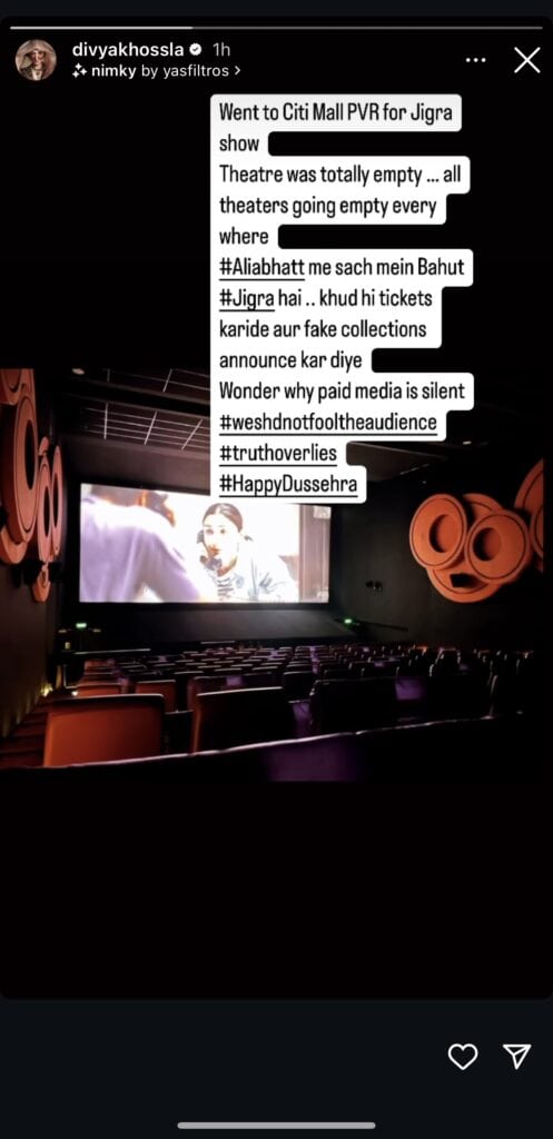 Divya also took a dig at Alia Bhatt, the star of Jigra. She said, “Alia doesn’t need these tricks; she’s already a big name. But real courage is speaking out against what’s wrong. Let the audience decide, not money and power.”