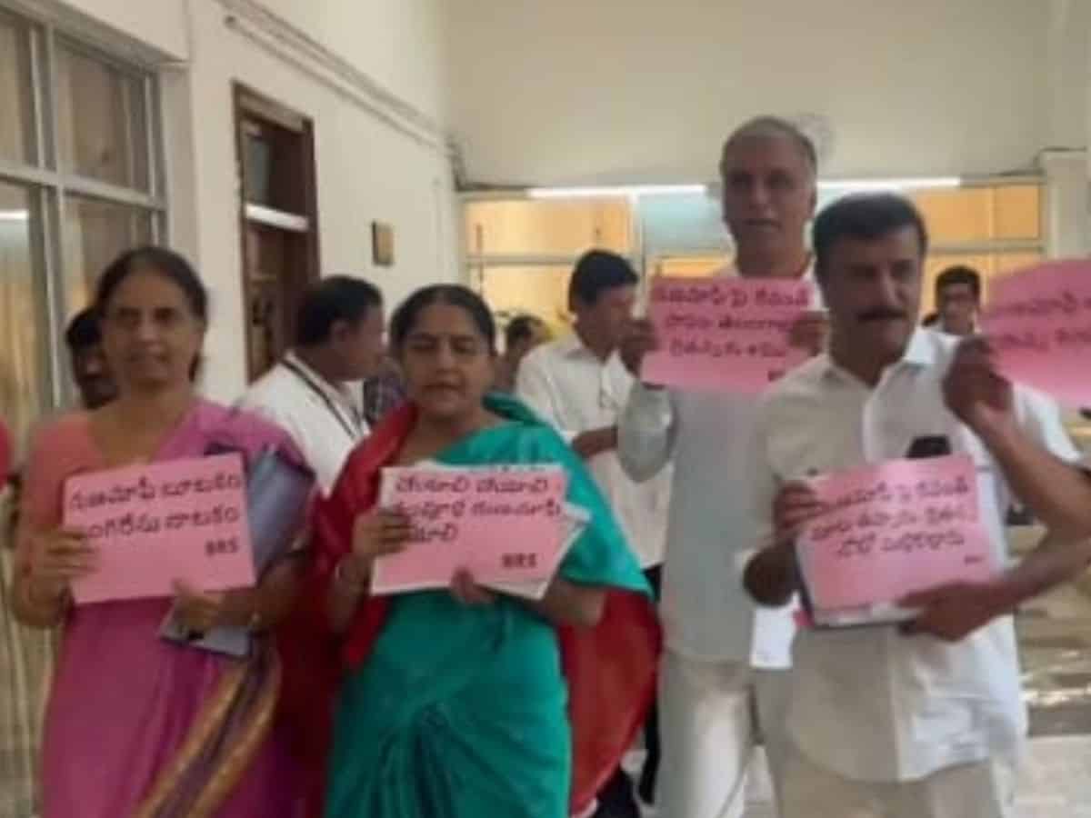 BRS MLAs, led by Siddipet MLA T Harish Rao, Narsapur MLA Sunitha Laxma Reddy, Maheshwaram MLA Sabitha Indra Reddy, Dubbak MLA Kotha Prabhakar Reddy, and LB Nagar MLA D Sudheer Reddy entered the Assembly premises with black badges, holding placards and raising slogans, demanding the state government to waive all farm loans up to Rs 2 lakh.