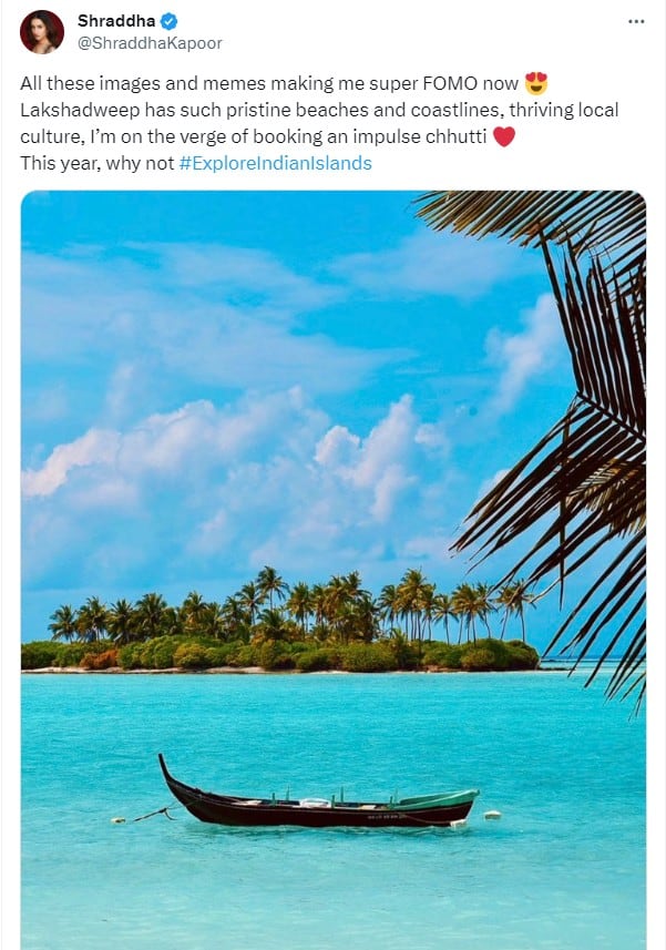 Actor Shraddha Kapoor expressed her desire to explore Lakshadweep’s pristine beaches and coastlines.