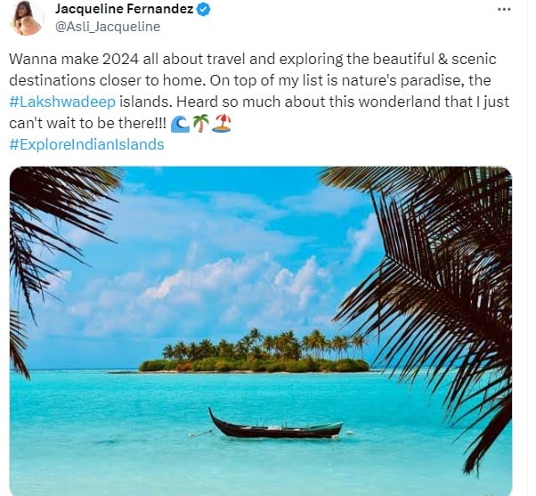 Taking to X, actor Jacqueline Fernandez wrote, “Wanna make 2024 all about travel and exploring the beautiful & scenic destinations closer to home. On top of my list is nature’s paradise, the #Lakshwadeep islands. Heard so much about this wonderland that I just can’t wait to be there!!! #ExploreIndianIslands.”