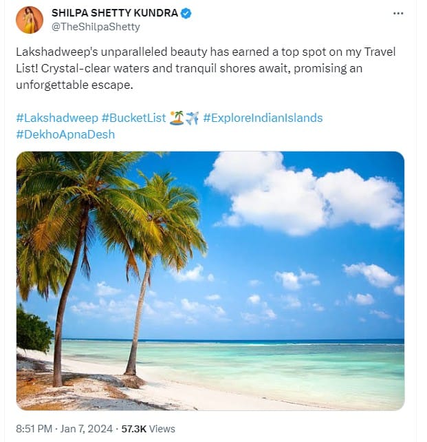 Taking to X, actor Shilpa Shetty Kundra wrote, “Lakshadweep’s unparalleled beauty has earned a top spot on my Travel List! Crystal-clear waters and tranquil shores await, promising an unforgettable escape. #Lakshadweep #BucketList #ExploreIndianIslands #DekhoApnaDesh.”