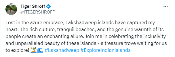 “Actor Tiger Shroff also talked about the beauty of Indian islands. Lost in the azure embrace, Lakshadweep islands have captured my heart. The rich culture, tranquil beaches, and the genuine warmth of its people create an enchanting allure. Join me in celebrating the inclusivity and unparalleled beauty of these islands – a treasure trove waiting for us to explore! #Lakshadweep #ExploreIndianIslands,” he wrote.