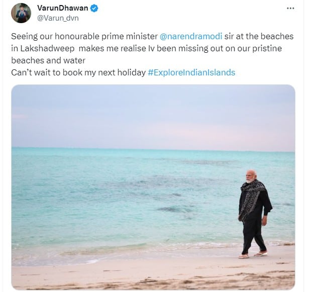 Actor Varun Dhawan on X wrote, “Seeing our honourable prime minister@narendramodi sir at the beaches in Lakshadweep makes me realise Iv been missing out on our pristine beaches and water Can’t wait to book my next holiday #ExploreIndianIslands.”