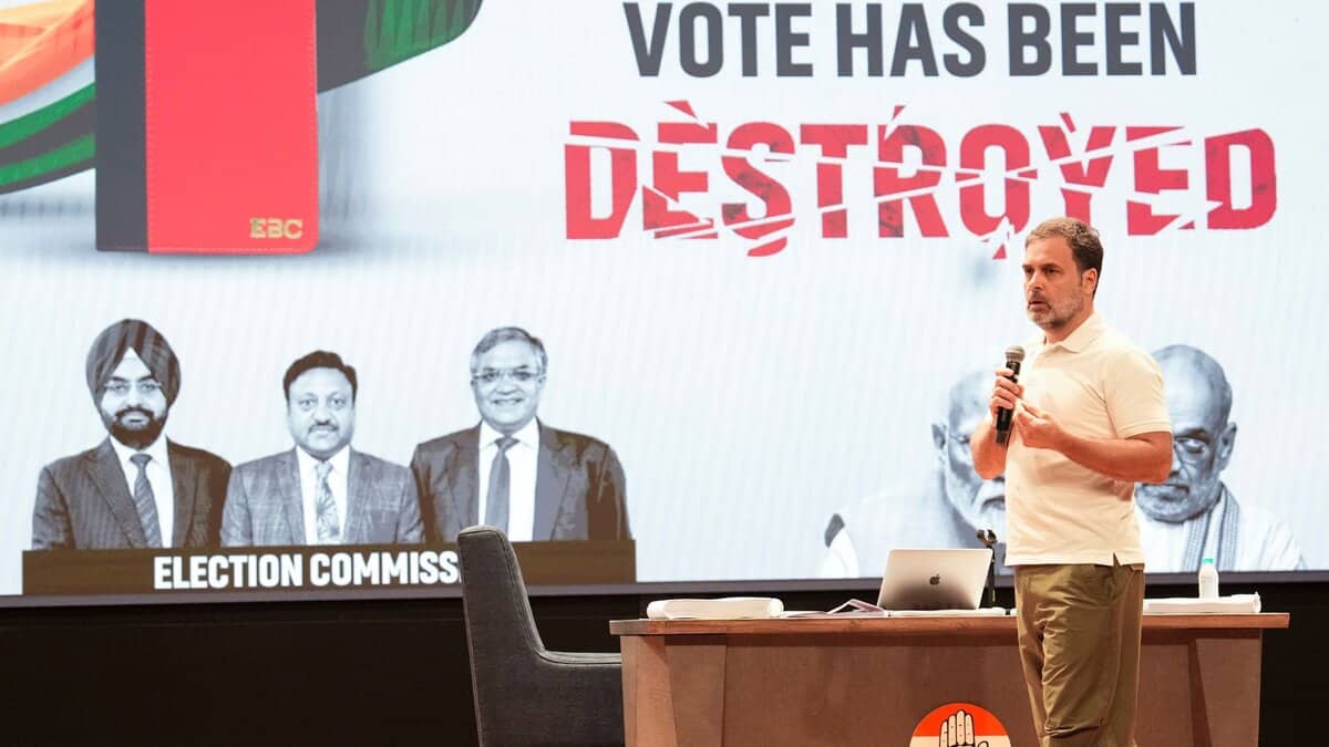 Gandhi alleged there was “vote chori” of 1,00,250 votes in the Mahadevapura segment, with 11,965 duplicate voters in the segment, 40,009 voters with fake and invalid addresses, 10,452 bulk voters or single address voters, 4,132 voters with invalid photos and 33,692 voters misusing Form 6 of new voters.
