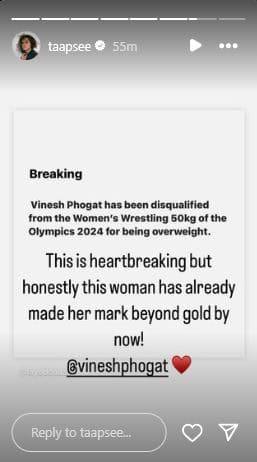 Actress Taapsee Pannu took to Instagram to express her support, writing, “This is heartbreaking but honestly this woman has already made her mark beyond gold by now! @vineshphogat.”