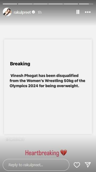 Rakul Preet Singh, shared her feelings on Instagram Stories, simply noting, “Heartbreaking,” accompanied by a broken heart emoticon.