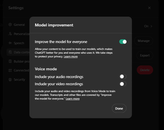 However, the users can prevent their data from being used for model training by adjusting their settings: