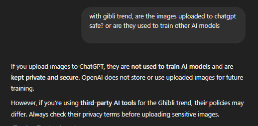 When asked about the Ghibli-style image trend, ChatGPT responded that images uploaded to the platform are not used to train AI models. It stated that OpenAI keeps them private and secure without storing or using them for future training.