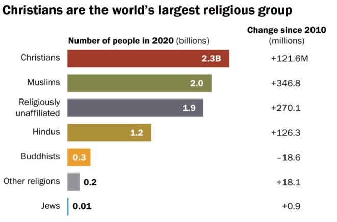 In an interesting discovery, the report states that people with no religious affiliation, atheists, rose by 270 million, reaching 1.9 billion. They have climbed to 24.2 percent, next to Muslims.