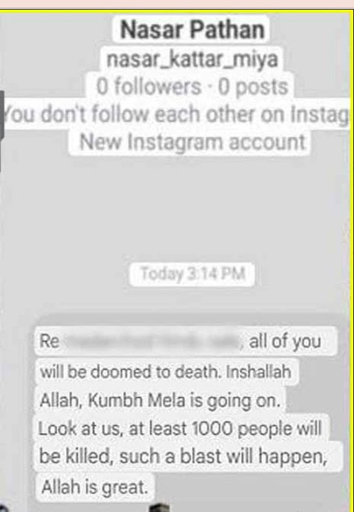 The accused, Ayush Kumar Jaiswal, used an online identity fake “Nasir Pathan” ID on social media and shared a threatening message on December 31.