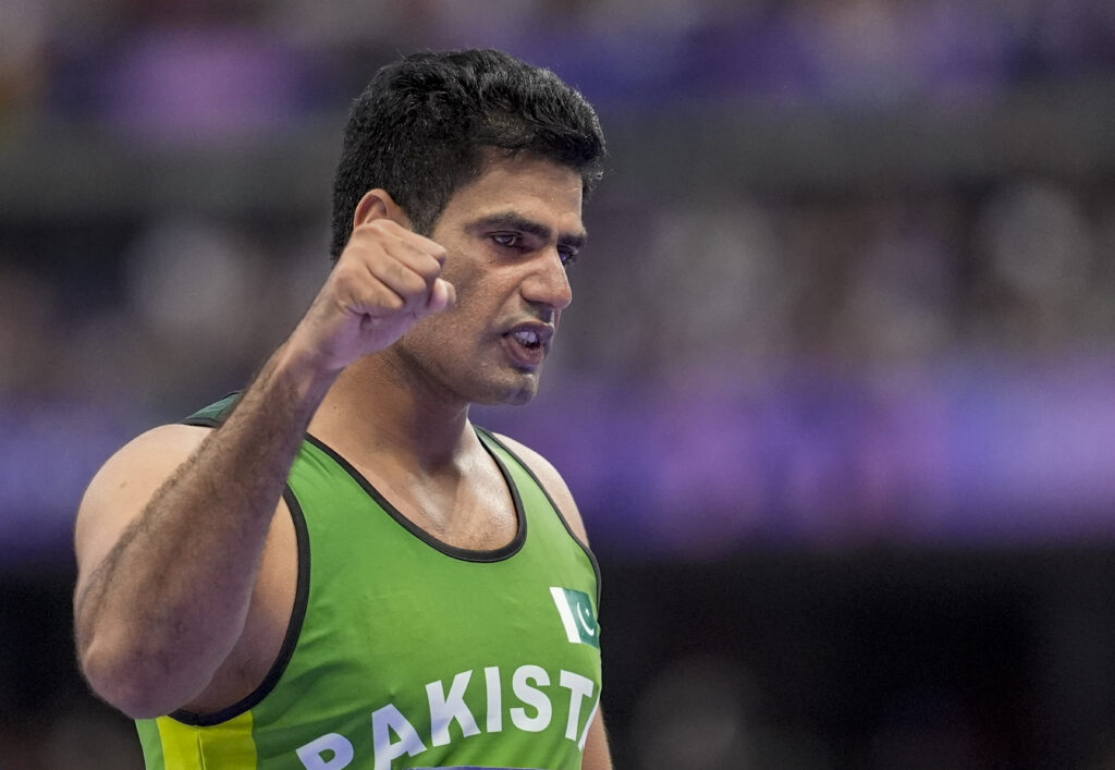Paris: Pakistan’s Arshad Nadeem celebrates after his second attempt during the men’s javelin throw final at the 2024 Summer Olympics, in Paris, France, Thursday, Aug. 8, 2024. (PTI Photo/Ravi Choudhary)