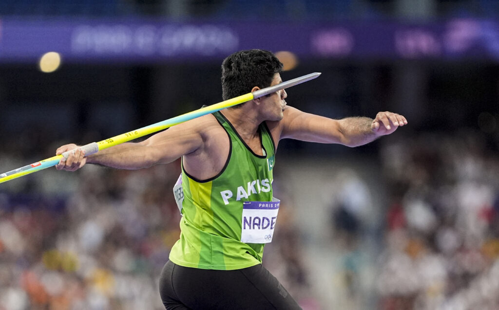 Paris: Pakistan’s Arshad Nadeem competes in the men’s javelin throw final at the 2024 Summer Olympics, in Paris, France, Thursday, Aug. 8, 2024. (PTI Photo/Ravi Choudhary)