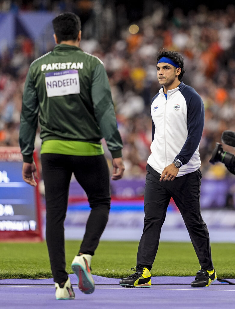 Paris: India’s Neeraj Chopra and Pakistan’s Arshad Nadeem during the men’s javelin throw final at the 2024 Summer Olympics, in Paris, France, Thursday, Aug. 8, 2024. (PTI Photo/Ravi Choudhary)