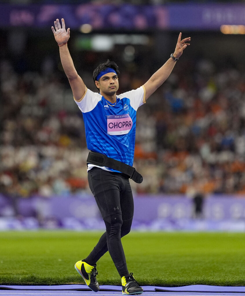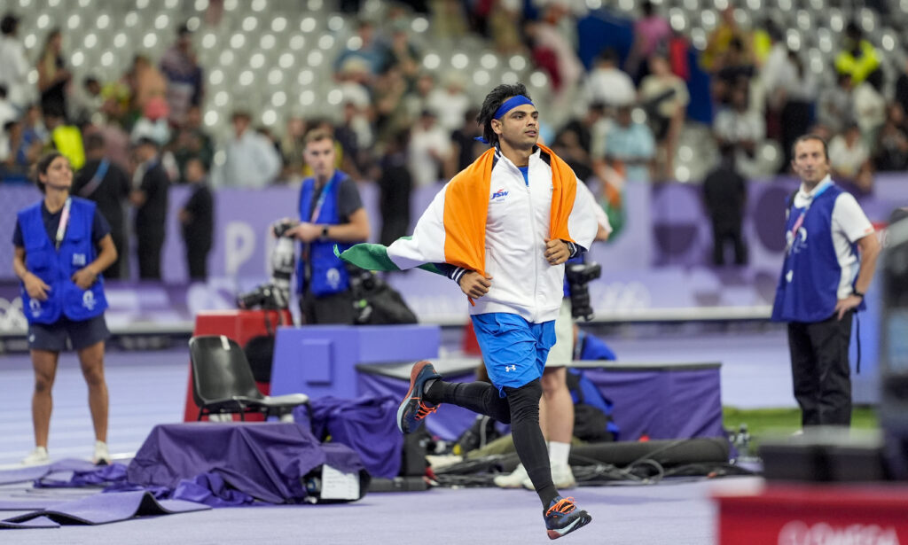 Paris: India’s Neeraj Chopra celebrates after winning the silver medal in the men’s javelin throw athletics event at the 2024 Summer Olympics, in Paris, France, Thursday, Aug. 8, 2024. (PTI Photo/Ravi Choudhary)