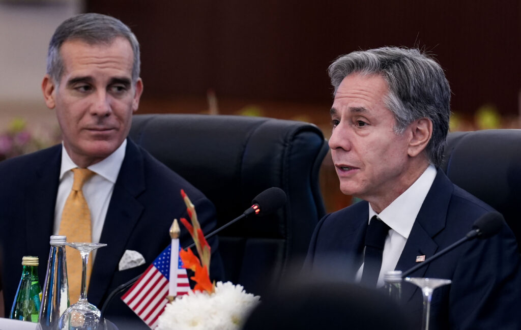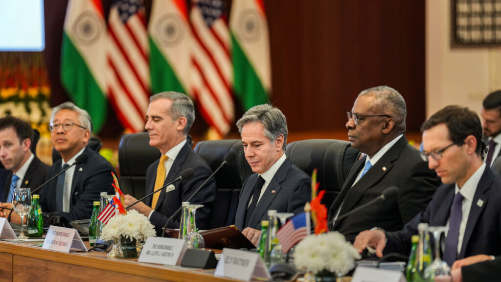 New Delhi: US Secretary of State Antony Blinken and Ambassador of US to India Eric Garcetti during the 5th India-US 2+2 Ministerial Dialogue, at Sushma Swaraj Bhavan, in New Delhi, Friday, Nov. 10, 2023. (PTI Photo/Kamal Singh)