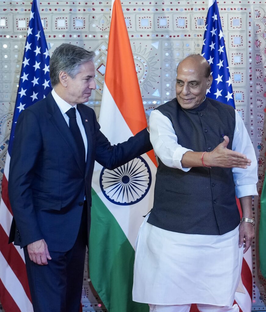 New Delhi: Defence Minister Rajnath Singh with US Secretary of State Antony Blinken and US Secretary of Defence Lloyd Austin before the 5th India-US 2+2 Ministerial Dialogue, at Sushma Swaraj Bhavan, in New Delhi, Friday, Nov. 10, 2023. (PTI Photo/Kamal Singh)