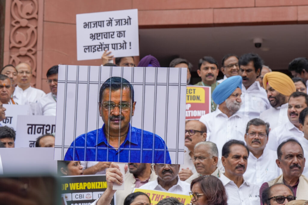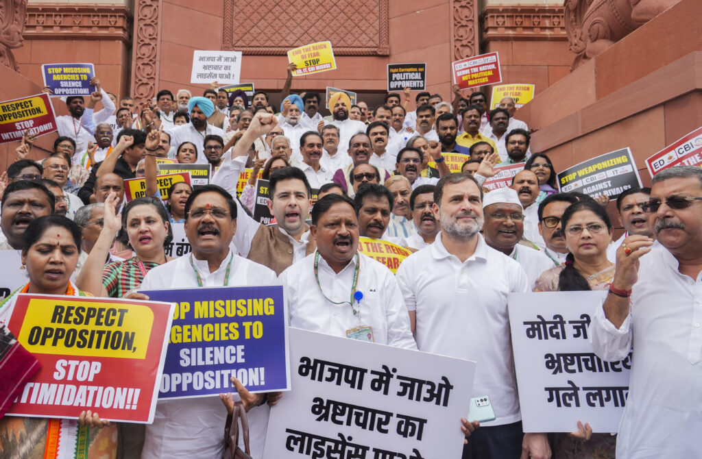 New Delhi: INDIA bloc MPs stage a protest against the alleged misuse of probe agencies by the central government, during ongoing Parliament session, in New Delhi, Monday, July 1, 2024. (PTI Photo/Shahbaz Khan)