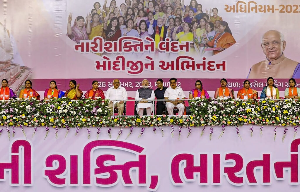 Ahmedabad: Prime Minister Narendra Modi with Gujarat Chief Minister Bhupendra Patel and others during ‘Nari Shakti Vandan – Abhinandan’ event, in Ahmedabad, Tuesday, Sept. 26, 2023. (PTI Photo)