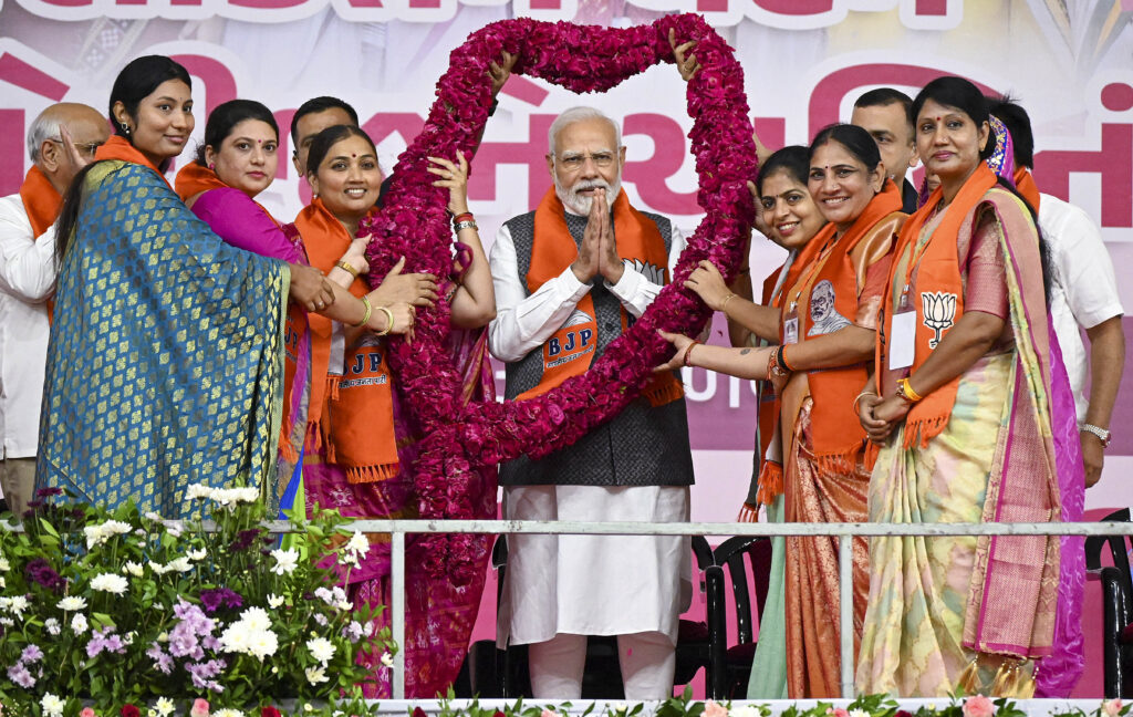 Ahmedabad: Prime Minister Narendra Modi being Garlanded during the ‘Nari Shakti Vandan – Abhinandan’ event, in Ahmedabad, Tuesday, Sept. 26, 2023. (PTI Photo)
