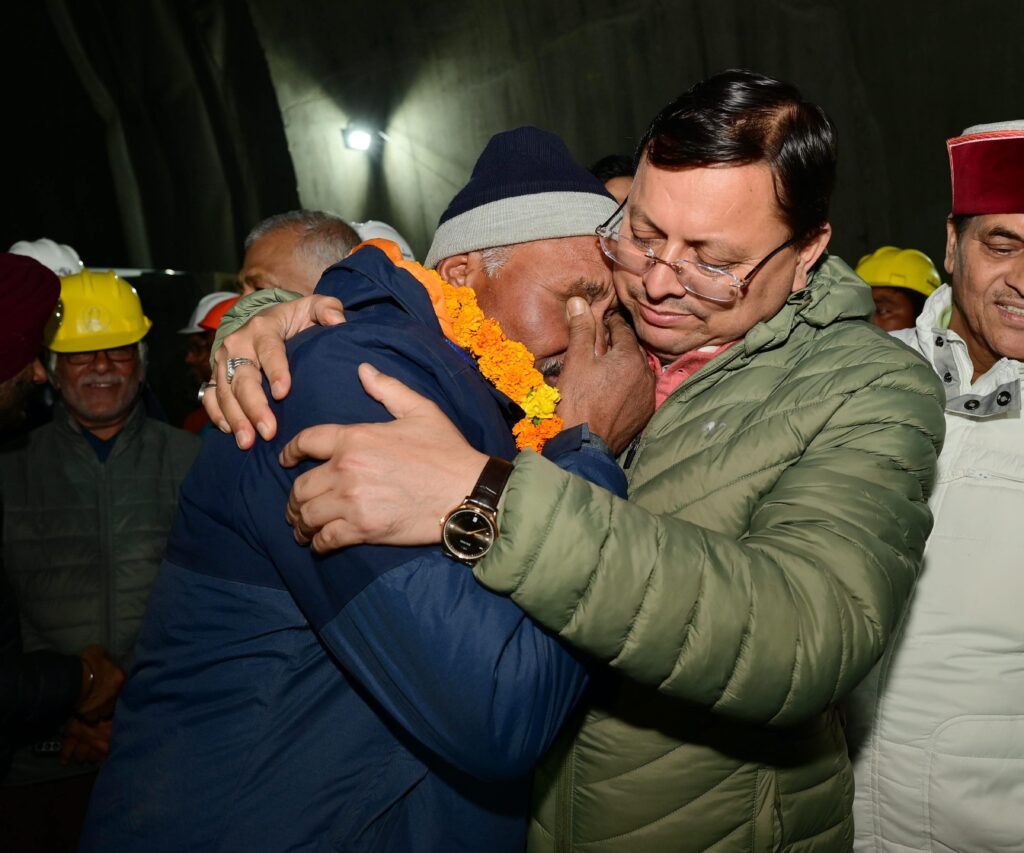 Uttarkashi: Uttarakhand Chief Minister Pushkar Singh Dhami greets a rescued worker after a successful evacuation at the under-construction Silkyara Bend-Barkot Tunnel, in Uttarkashi district, Wednesday, Nov. 29, 2023. (PTI Photo)