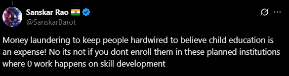 This X user weighed in with their opinion, “Money laundering to keep people hardwired to believe child education is an expense! No its not if you dont enroll them in these planned institutions where 0 work happens on skill development”