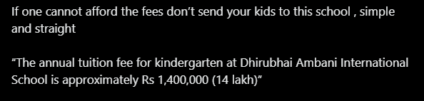 Others have gone so far as to comment about other schools, as another person comments, “If one cannot afford the fees don’t send your kids to this school , simple and straight ‘The annual tuition fee for kindergarten at Dhirubhai Ambani International School is approximately Rs 1,400,000 (14 lakh).'”