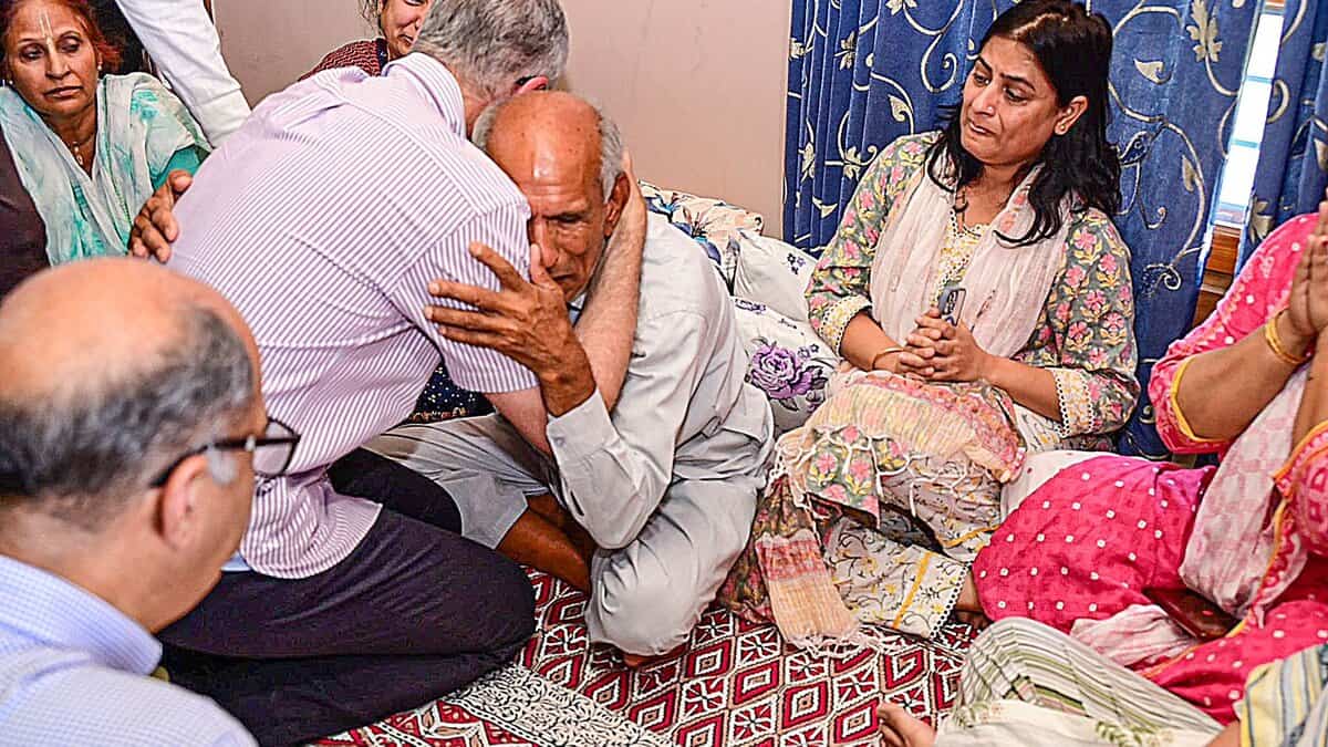 Chief Minister Omar Abdullah visited the bereaved family at Roopnagar and was seen hugging his father, Durga Dass, to condole his son’s death.