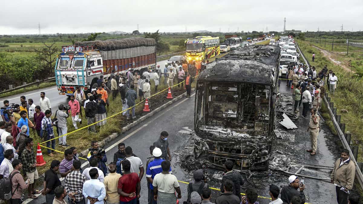 Police investigation revealed that the bus ran over a motorcycle lying on the road after the rider rammed it into the road divider. The bus dragged the bike for about 200 metres, and the friction and fuel leakage from the bike ignited a massive fire, which quickly engulfed the entire bus.