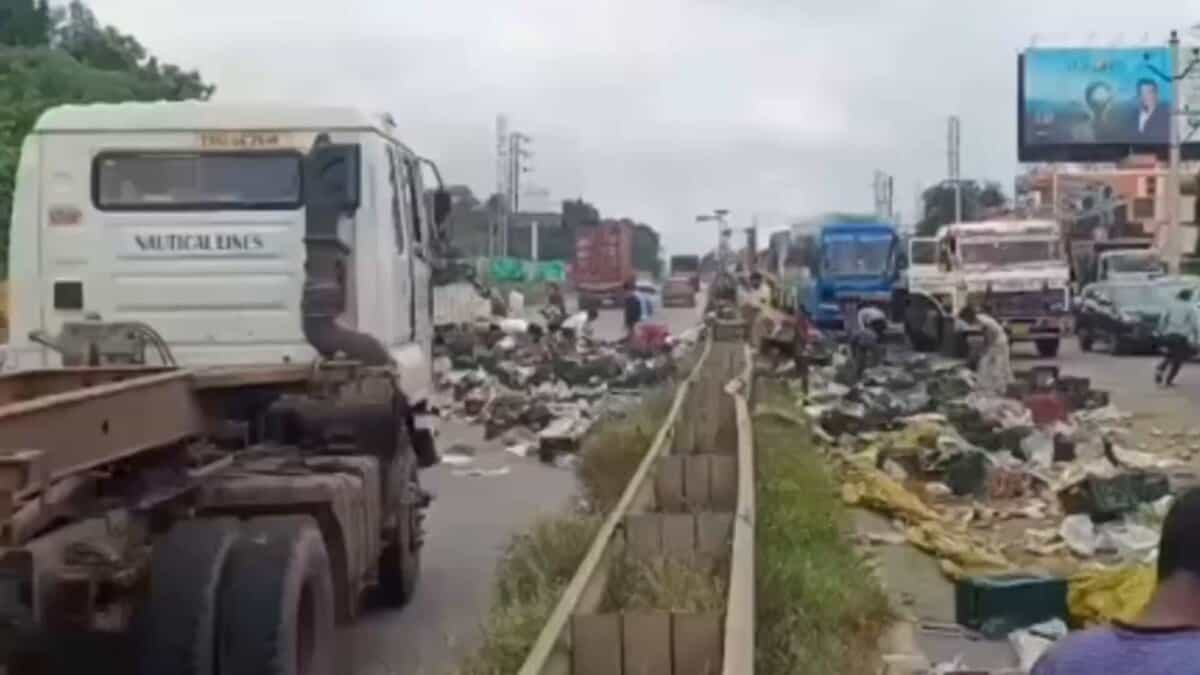 Hyderabad: Residents of Rangareddy rejoiced and fled with mangoes on Saturday morning, June 14, when a truck carrying the fruits overturned on the highway near Thimmapur village road in Kothur Mandal. The vehicle was en route to the city when the driver lost control, leading to the accident.