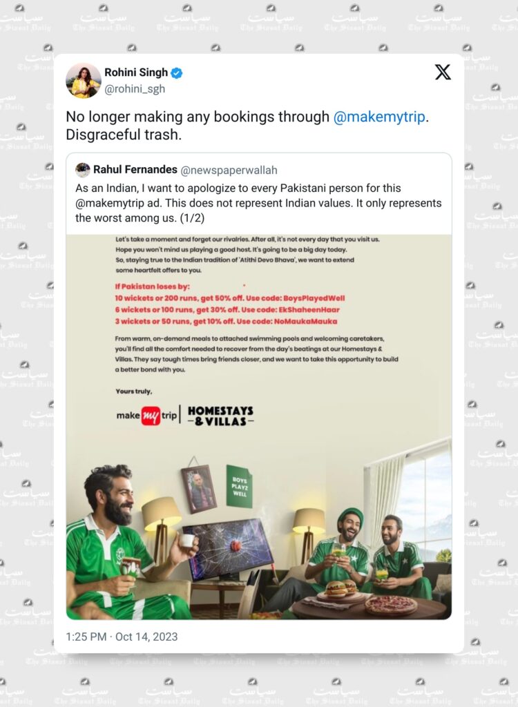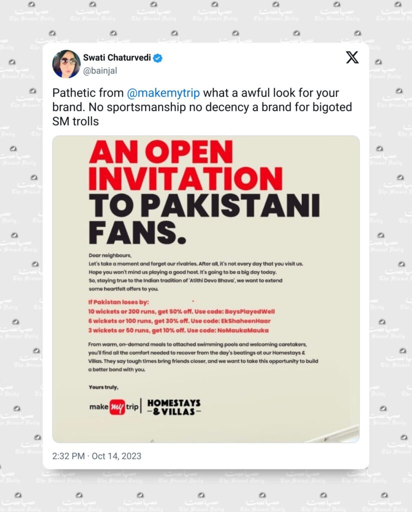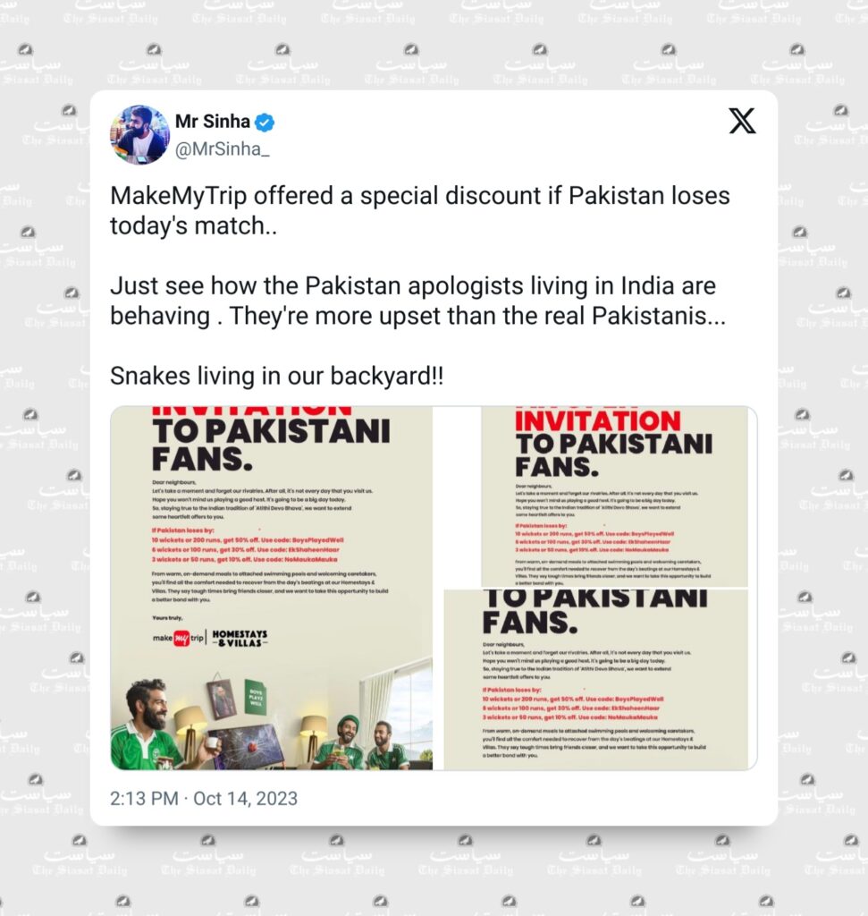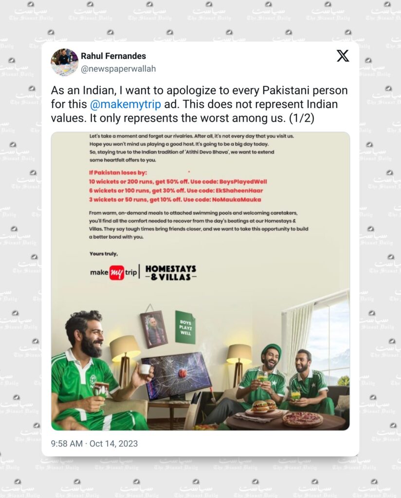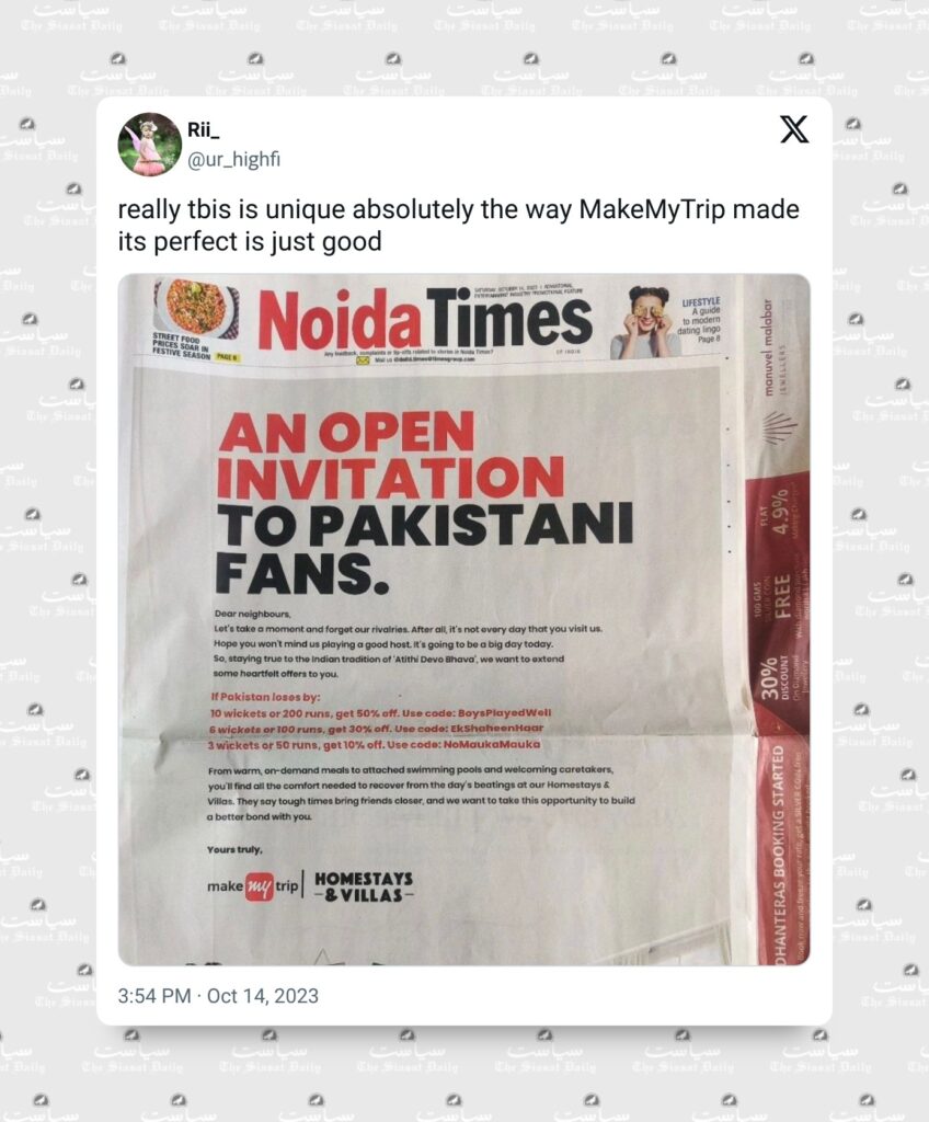 The advertisement team of the online ticketing platform MakeMyTrip found itself in a soup on Saturday, October 14, after the publication of a one-page ad blatantly offered visiting Pakistani fans discounts if their team lost to India ahead of the ICC World Cup India vs Pakistan at Ahmedabad’s Narendra Modi stadium.