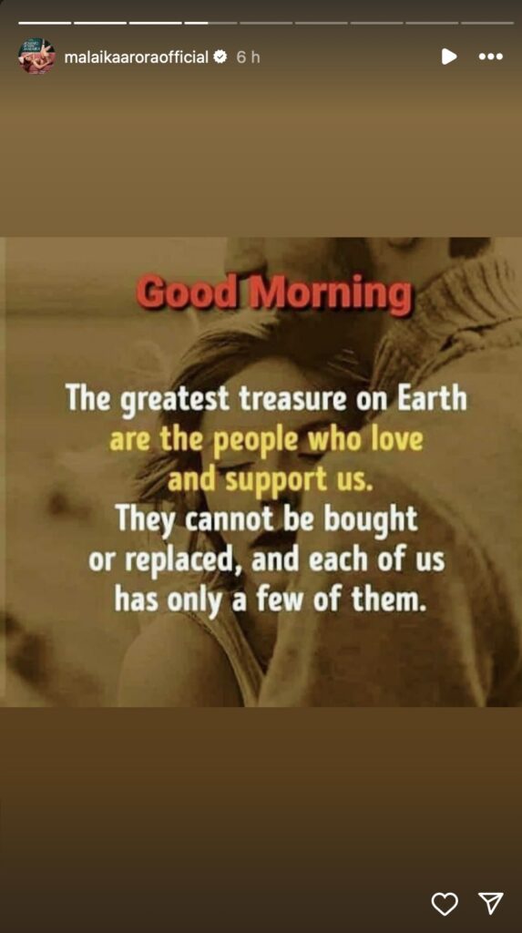 Malaika Arora has shared a cryptic note on her Instagram stories amid her breakup reports with Arjun Kapoor. On Friday morning, the diva shared a post which talked about people who “love and support” you. “The greatest treasure on earth are the people who love and support us. They cannot be bought or replaced, and each of us has only a few of them,” the post read.
