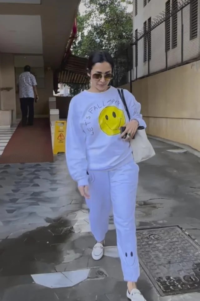 In the video, Malaika can be seen walking out of an eye clinic. She is absolutely stunning. The actress wore a white co-ord set for the outing. Malaika kept her look simple with a tote bag, glasses, and a sleek hairstyle. The print on her sweatshirt, however, drew our attention. Malaika’s sweatshirt featured a yellow-hued smiley with the text “Let’s Fall Apart. Without a doubt, Malaika’s cryptic message-printed sweatshirt grabbed eyeballs quickly, fueling speculation about her breakup with Arjun Kapoor.