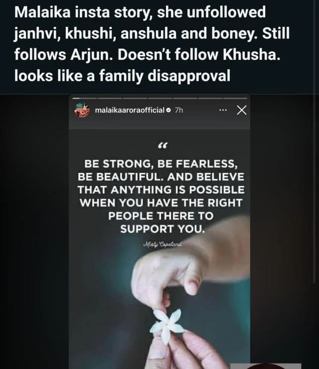 The Reddit user’s caption reads: “Malaika insta story, she unfollowed janhvi, khushi, anshula and boney. Still follows Arjun. Doesn’t follow Khushi. looks like a family disapproval.”