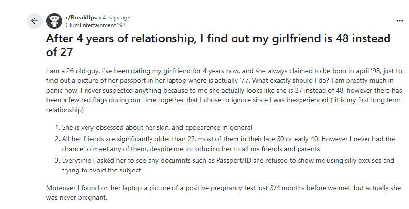 The man further revealed he had no reason to be suspicious of his girlfriend’s age. “There have been a few red flags during our time together that I chose to ignore since I was inexperienced (it is my first long-term relationship),” he said, adding that the woman was obsessed with her appearance and that all of her friends were significantly older than 27.