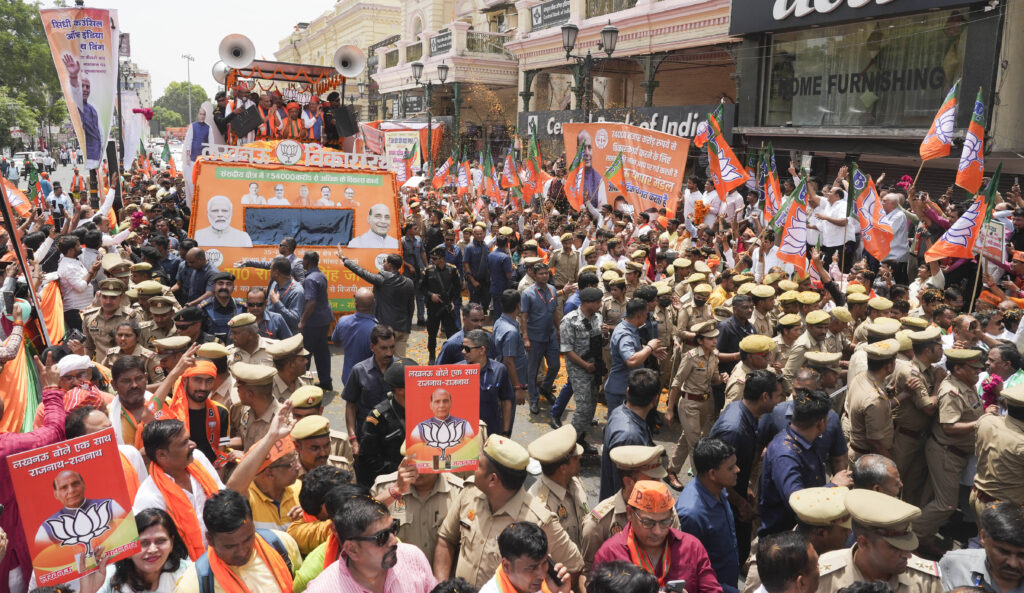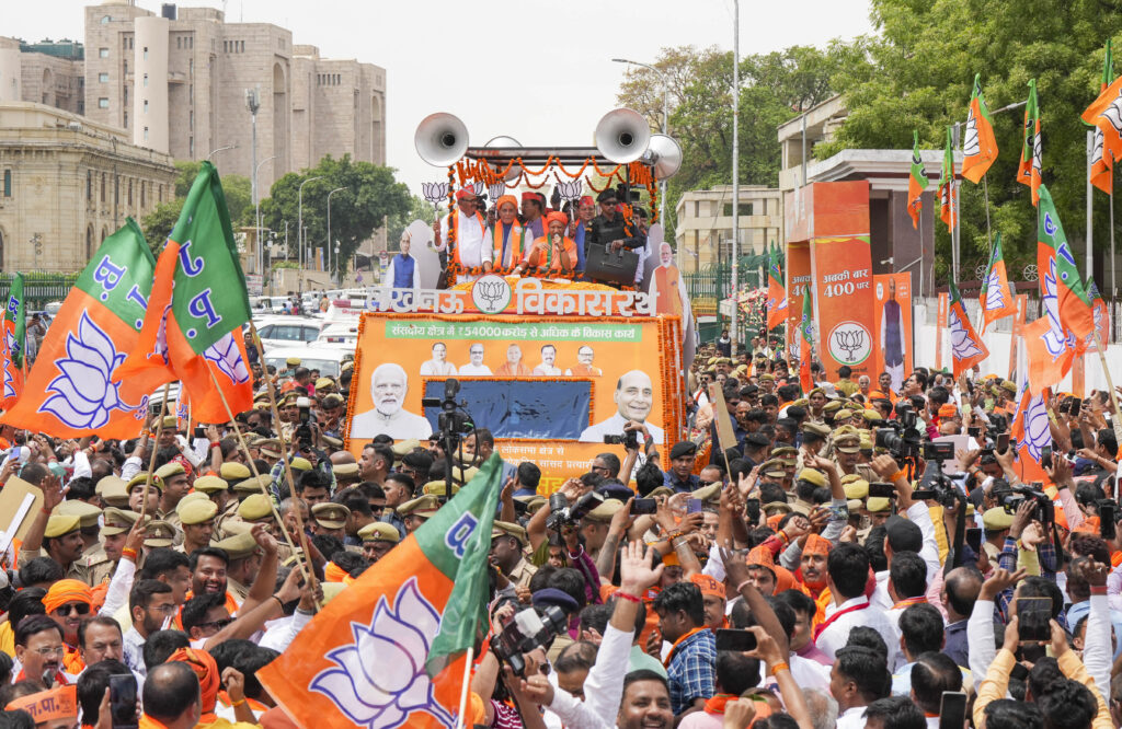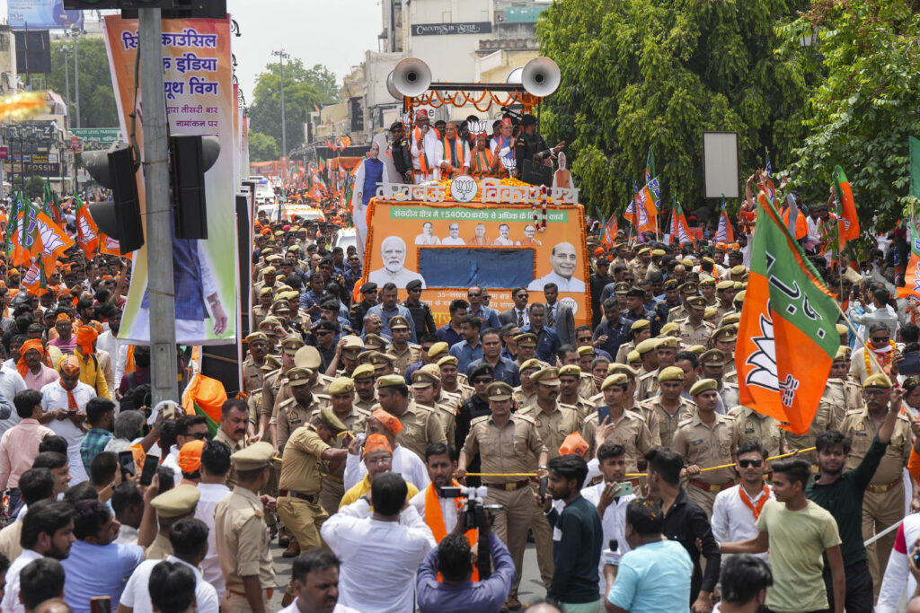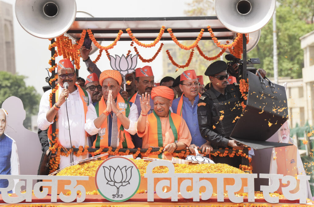 Lucknow: Defence Minister and BJP candidate Rajnath Singh with Uttar Pradesh Chief Minister Yogi Adityanath, Uttarakhand Chief Minister Pushkar Singh Dhami, and UP Deputy Chief Ministers Brajesh Pathak and Keshav Prasad Maurya during a road show before filing his nomination for Lok Sabha elections, in Lucknow, Monday, April 29, 2024. (PTI Photo/Nand Kumar)Lucknow: Defence Minister and BJP candidate Rajnath Singh with Uttar Pradesh Chief Minister Yogi Adityanath, Uttarakhand Chief Minister Pushkar Singh Dhami, and UP Deputy Chief Ministers Brajesh Pathak and Keshav Prasad Maurya during a road show before filing his nomination for Lok Sabha elections, in Lucknow, Monday, April 29, 2024. (PTI Photo/Nand Kumar)Lucknow: Defence Minister and BJP candidate Rajnath Singh with Uttar Pradesh Chief Minister Yogi Adityanath, Uttarakhand Chief Minister Pushkar Singh Dhami, and UP Deputy Chief Ministers Brajesh Pathak and Keshav Prasad Maurya during a road show before filing his nomination for Lok Sabha elections, in Lucknow, Monday, April 29, 2024. (PTI Photo/Nand Kumar)Lucknow: Defence Minister and BJP candidate Rajnath Singh with Uttar Pradesh Chief Minister Yogi Adityanath, Uttarakhand Chief Minister Pushkar Singh Dhami and UP Deputy Chief Minister Brajesh Pathak during a road show before filing his nomination for Lok Sabha elections, in Lucknow, Monday, April 29, 2024. (PTI Photo/Nand Kumar)
