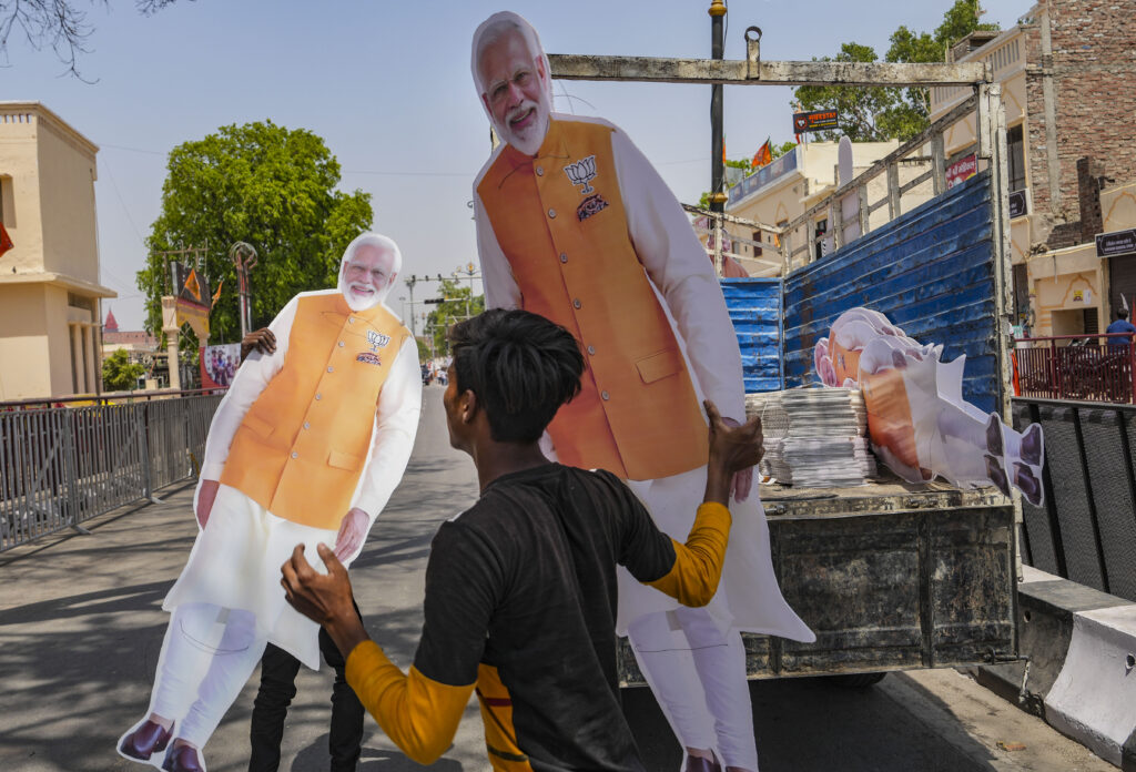 Ayodhya: Workers carry cutouts of Prime Minister Narendra Modi to be placed on a road ahead of PM Modis roadshow for the Lok Sabha elections, in Ayodhya, Sunday, May 5, 2024. (PTI Photo/Arun Sharma)