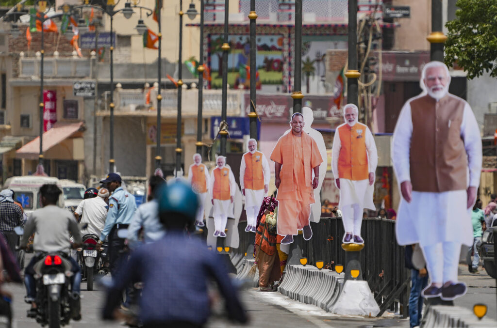 Ayodhya: Cutouts of Prime Minister Narendra Modi and Uttar Pradesh Chief Minister Yogi Adityanath are placed on a road ahead of PM Modis roadshow for the Lok Sabha elections, in Ayodhya, Sunday, May 5, 2024. (PTI Photo/Arun Sharma)