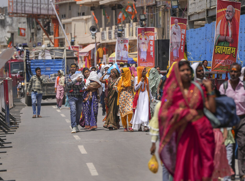 Ayodhya: People walk past banners of Prime Minister Narendra Modi on a hot summer day ahead of his roadshow for the Lok Sabha elections, in Ayodhya, Sunday, May 5, 2024. (PTI Photo/Arun Sharma)