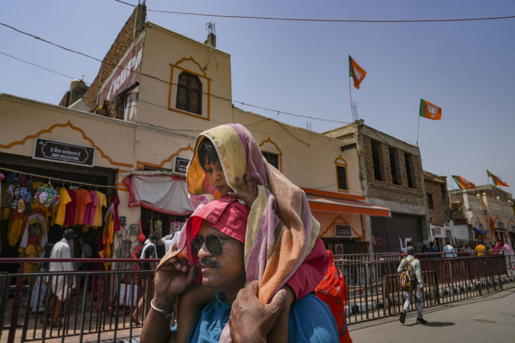 Ayodhya: A man carries a child on his shoulder on a hot summer day ahead of Prime Minister Narendra Modi’s roadshow for the Lok Sabha elections, in Ayodhya, Sunday, May 5, 2024. (PTI Photo/Arun Sharma)