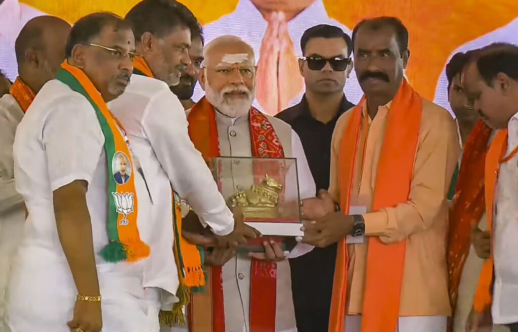Karimnagar: Prime Minister Narendra Modi being presented a memento during a public meeting for Lok Sabha polls, in Karimnagar, Wednesday, May 8, 2024. (PTI Photo)