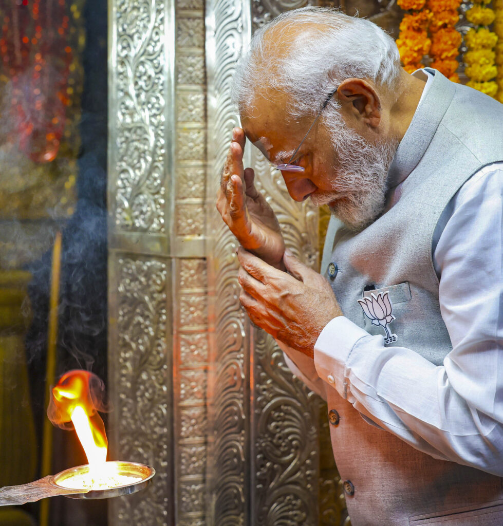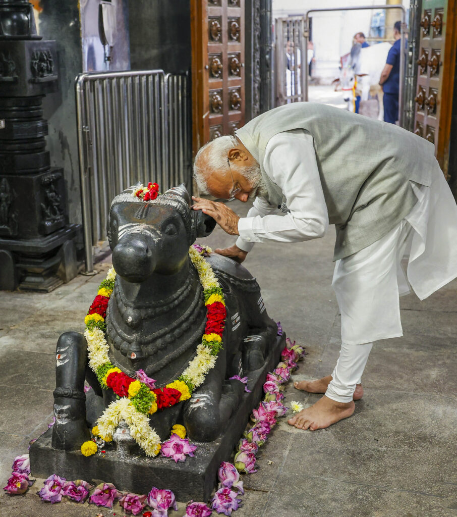 Vemulawada: Prime Minister Narendra Modi offers prayers at Sri Raja Rajeshwara Swamy temple, in Vemulawada, Wednesday, May 8, 2024. (PTI Photo)