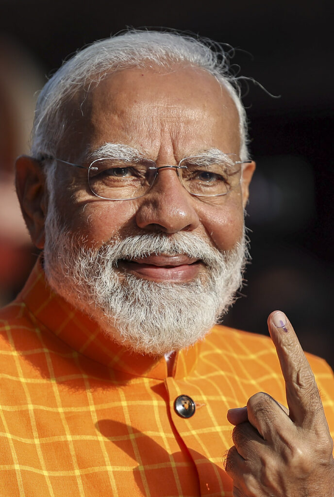 Ahmedabad: Prime Minister Narendra Modi shows his ink-marked finger after casting his vote at a polling station during the third phase of Lok Sabha elections, in Ahmedabad, Tuesday, May 7, 2024. (PTI Photo)