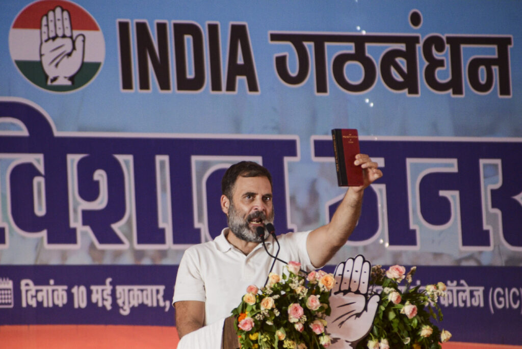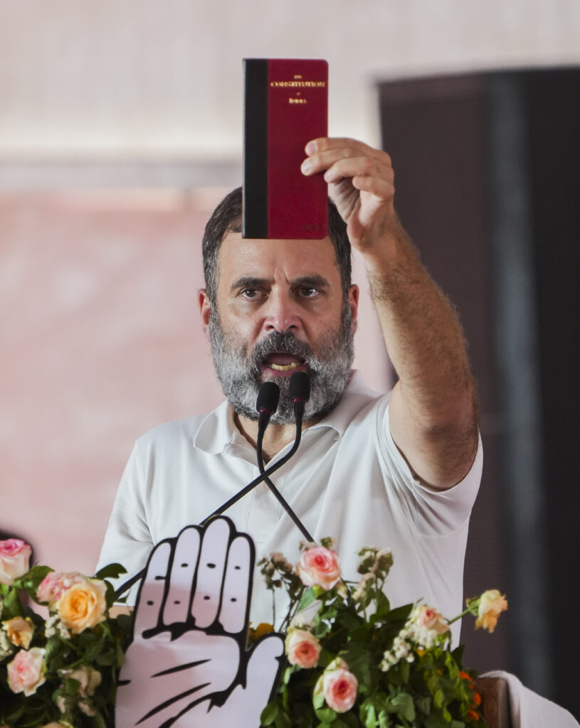 Kanpur: Congress leader Rahul Gandhi holds a copy of the ‘Constitution of India’ while addressing an election rally for the Lok Sabha polls, in Kanpur, Friday, May 10, 2024. (PTI Photo/Arun Sharma)