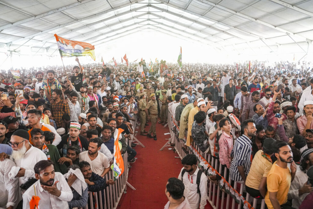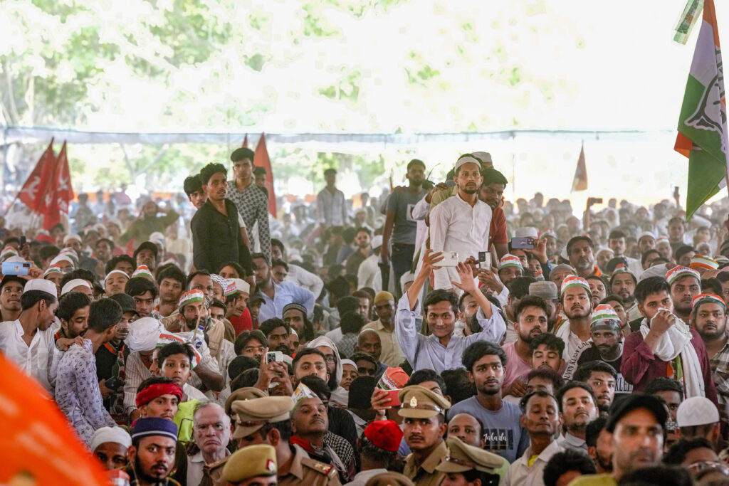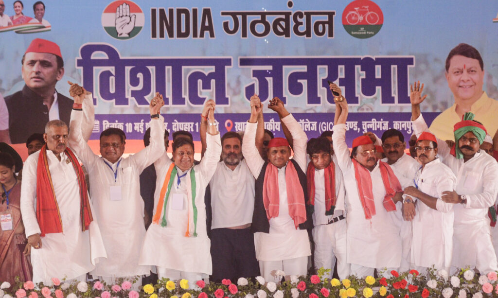 Kanpur: Supporters during INDIA bloc election rally addressed by Congress leader Rahul Gandhi and Samajwadi Party (SP) chief Akhilesh Yadav for the Lok Sabha polls, in Kanpur, Friday, May 10, 2024. (PTI Photo/Arun Sharma)