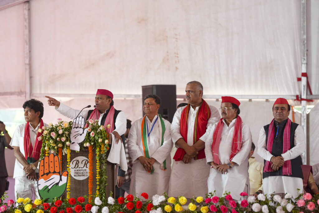 Kanpur: Congress leader Rahul Gandhi with Samajwadi Party (SP) chief Akhilesh Yadav, Congress candidate from Kanpur constituency Alok Misra and others during an election rally for the Lok Sabha polls, in Kanpur, Friday, May 10, 2024. (PTI Photo)